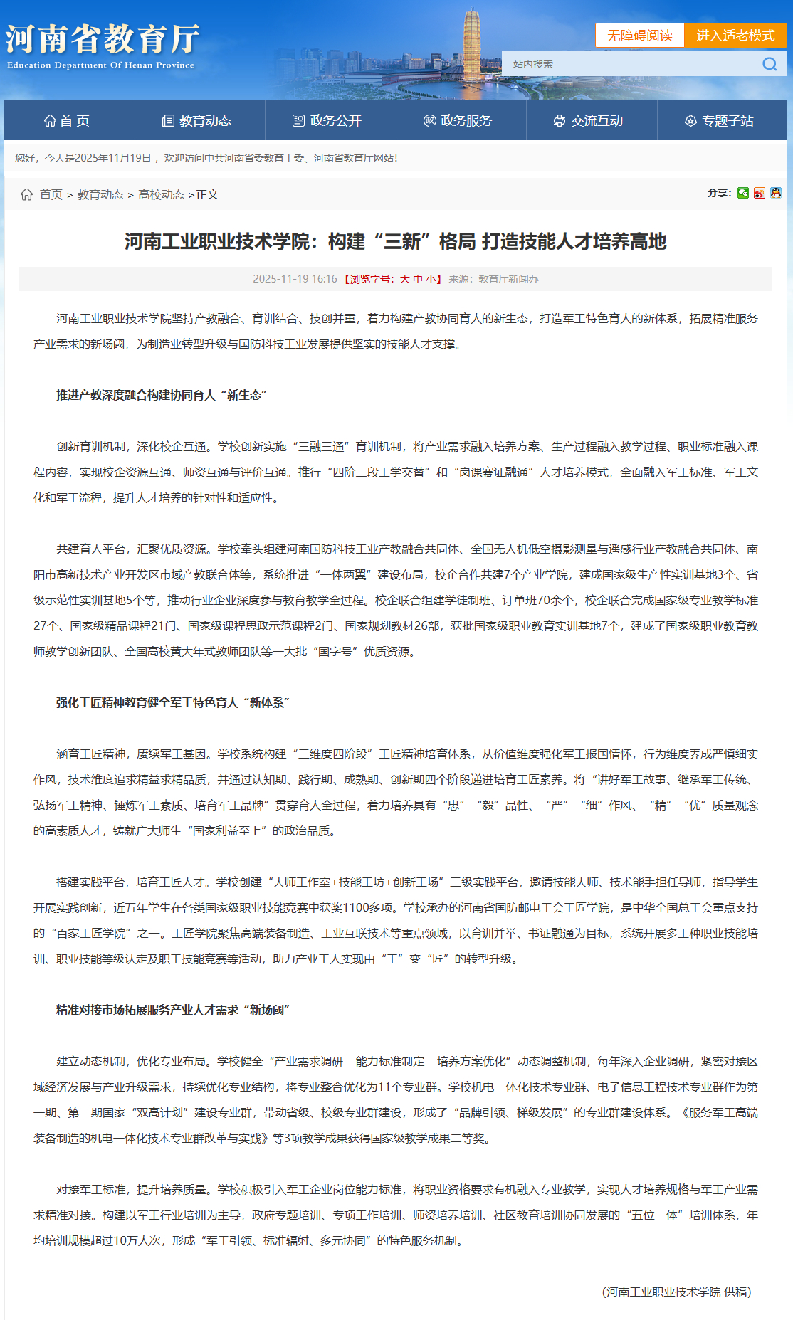 •  河南工业职业技术学院,成立于1973年,时名五三一机械工业学校。1978年,更名为中原机械工业学校。2001年,升格为高等职业技术学校——河南工业职业技术学院。现由河南省委教育工委、省教育厅管理。